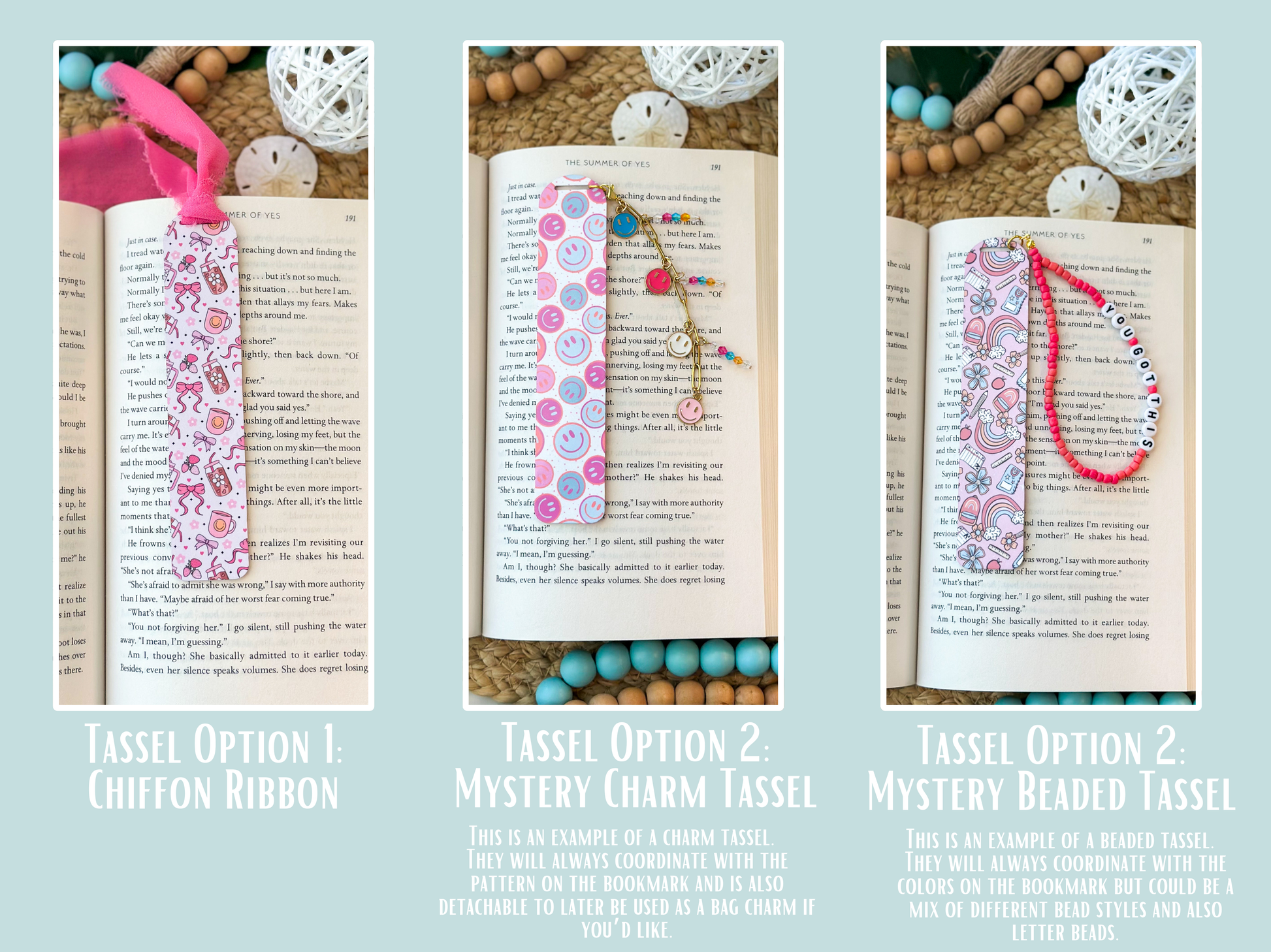 These bookmarks are so fun and unique... especially when you choose a mystery tassel! Everything in my shop is made to order so I hand assemble all tassels to coordinate with the pattern you choose for the bookmark. If you'd like a letter on your charm tassel or a name on your beaded tassel, please put that into the personalization section. You will also need to type "YES" to indicate that you do know it's a mystery tassel :)