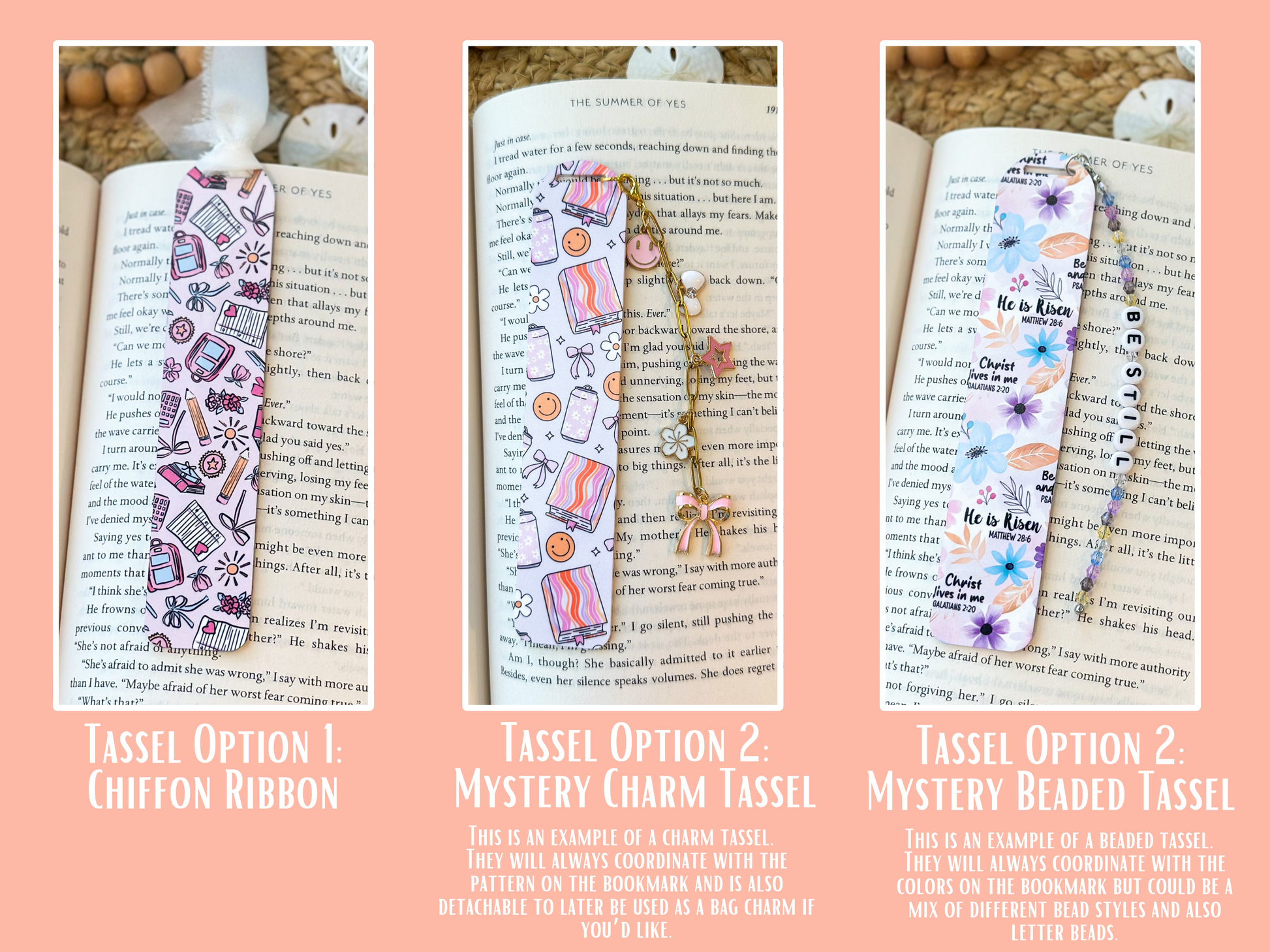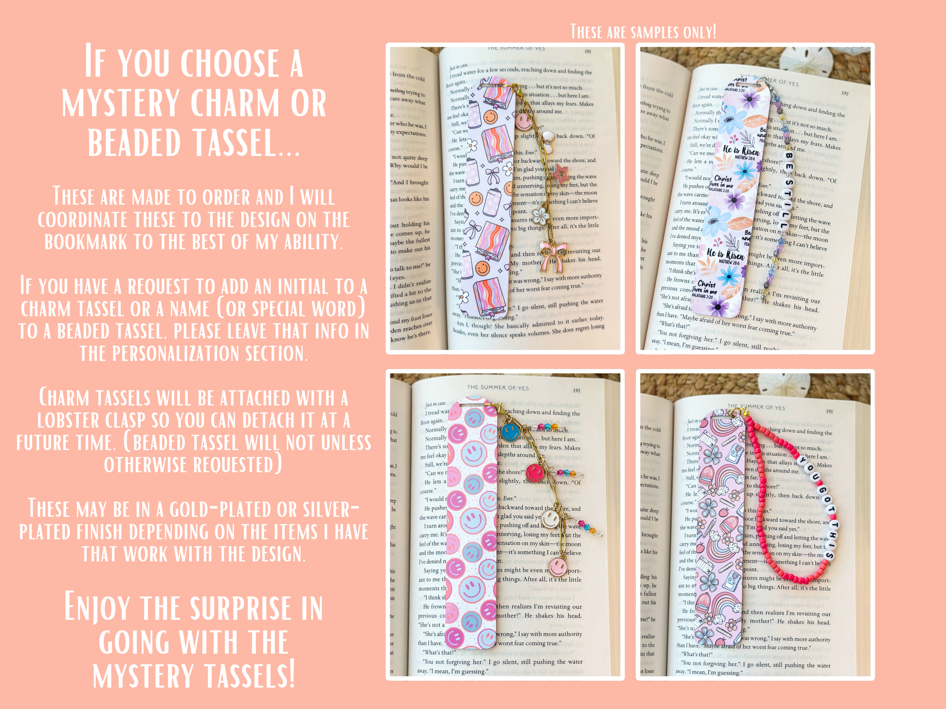 These bookmarks are so fun and unique... especially when you choose a mystery tassel! Everything in my shop is made to order so I hand assemble all tassels to coordinate with the pattern you choose for the bookmark. If you'd like a letter on your charm tassel or a name on your beaded tassel, please put that into the personalization section. You will also need to type "YES" to indicate that you do know it's a mystery tassel :)