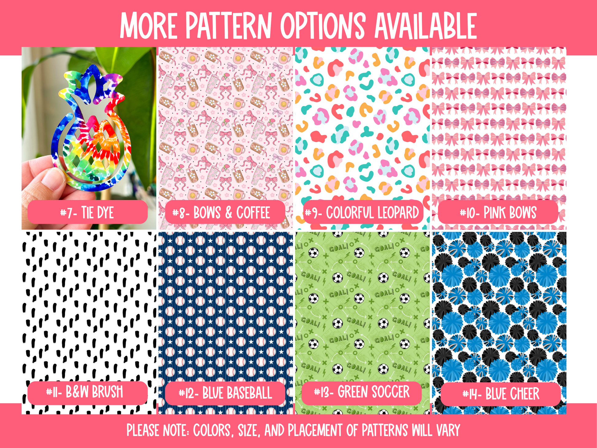 Made from acrylic with a sublimated design. Take a look at some of the other shapes and patterns we have in our shop. If you happen to see another pattern that is not an option within this shape, please let me know and I'll be happy to make it for you. All pattern designs are interchangeable within the different shapes.