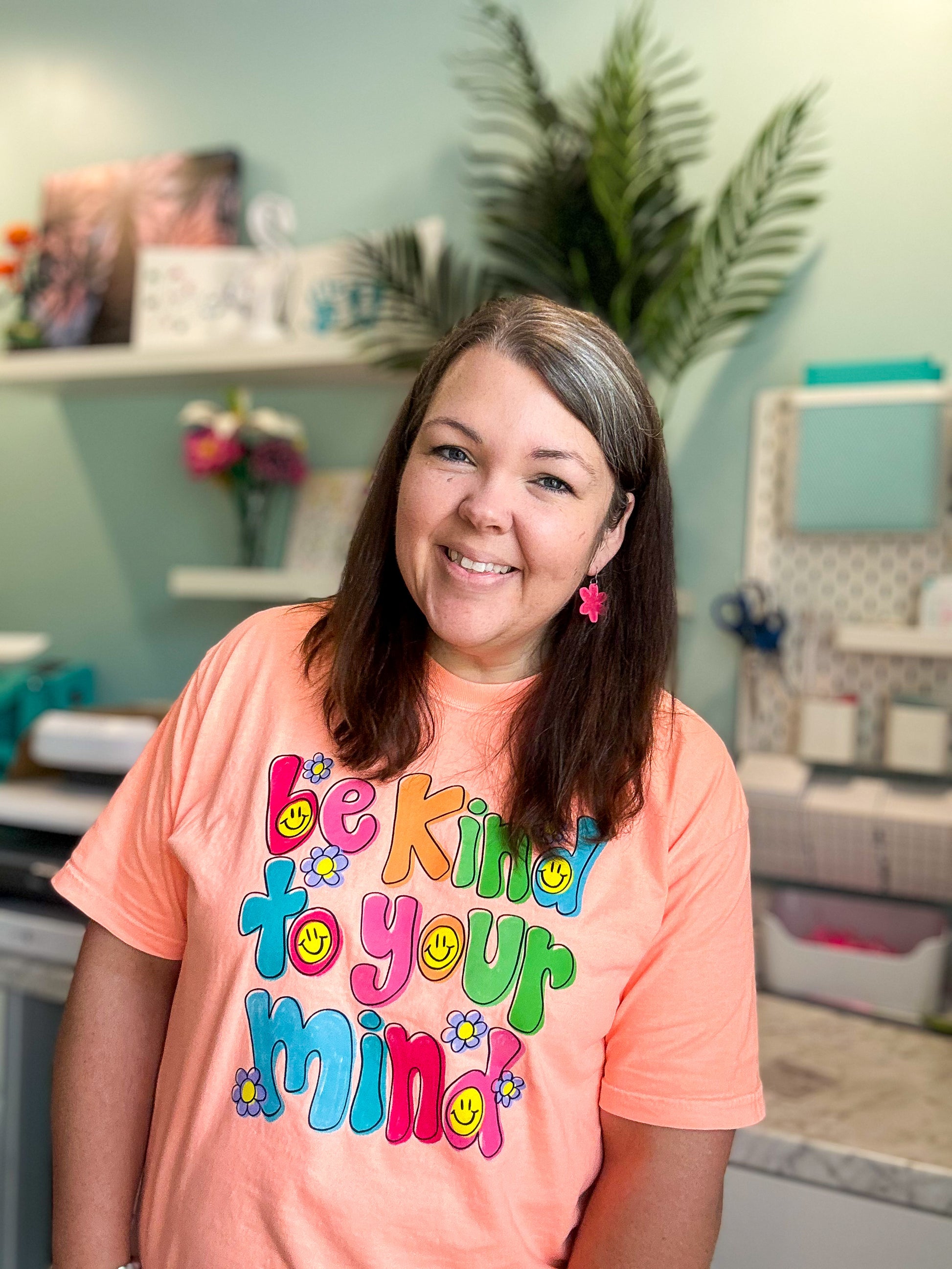 I don't know about you but I really love bright colorful shirts with a special meaning behind them. Take this shirt, for example... This is a beautiful neon cantaloupe shirt with a bright "Be Kind to Your Mind" graphic on the front. This is a Comfort Colors shirt.