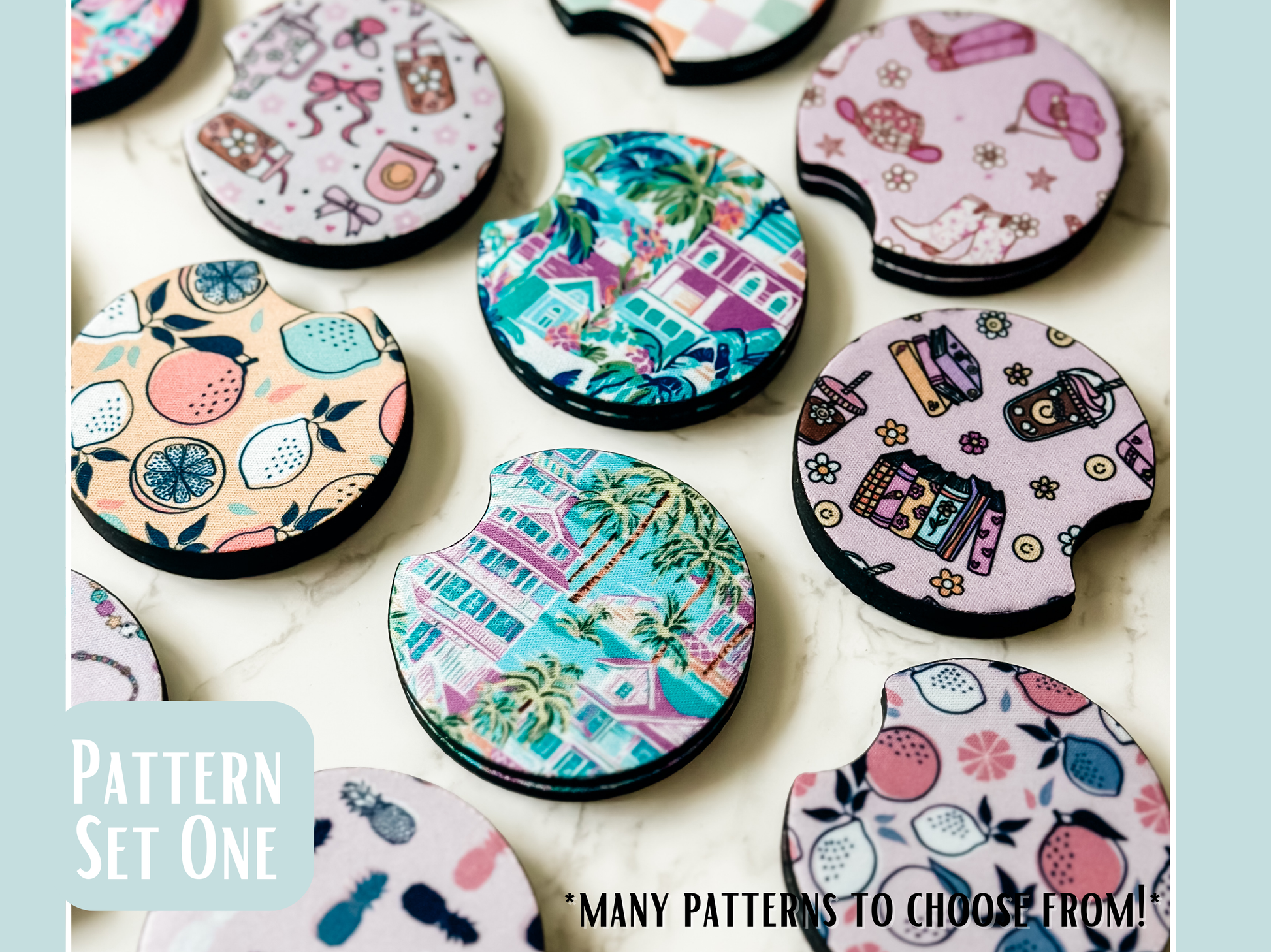 Set of 2 Car Coasters. 2 sublimated neoprene car coasters. Comes packaged to stay nice and clean until you are ready to use it or gift it to a friend. Perfect to add a little whimsy to your car but also soak up that annoying cup sweat, am I right? :)