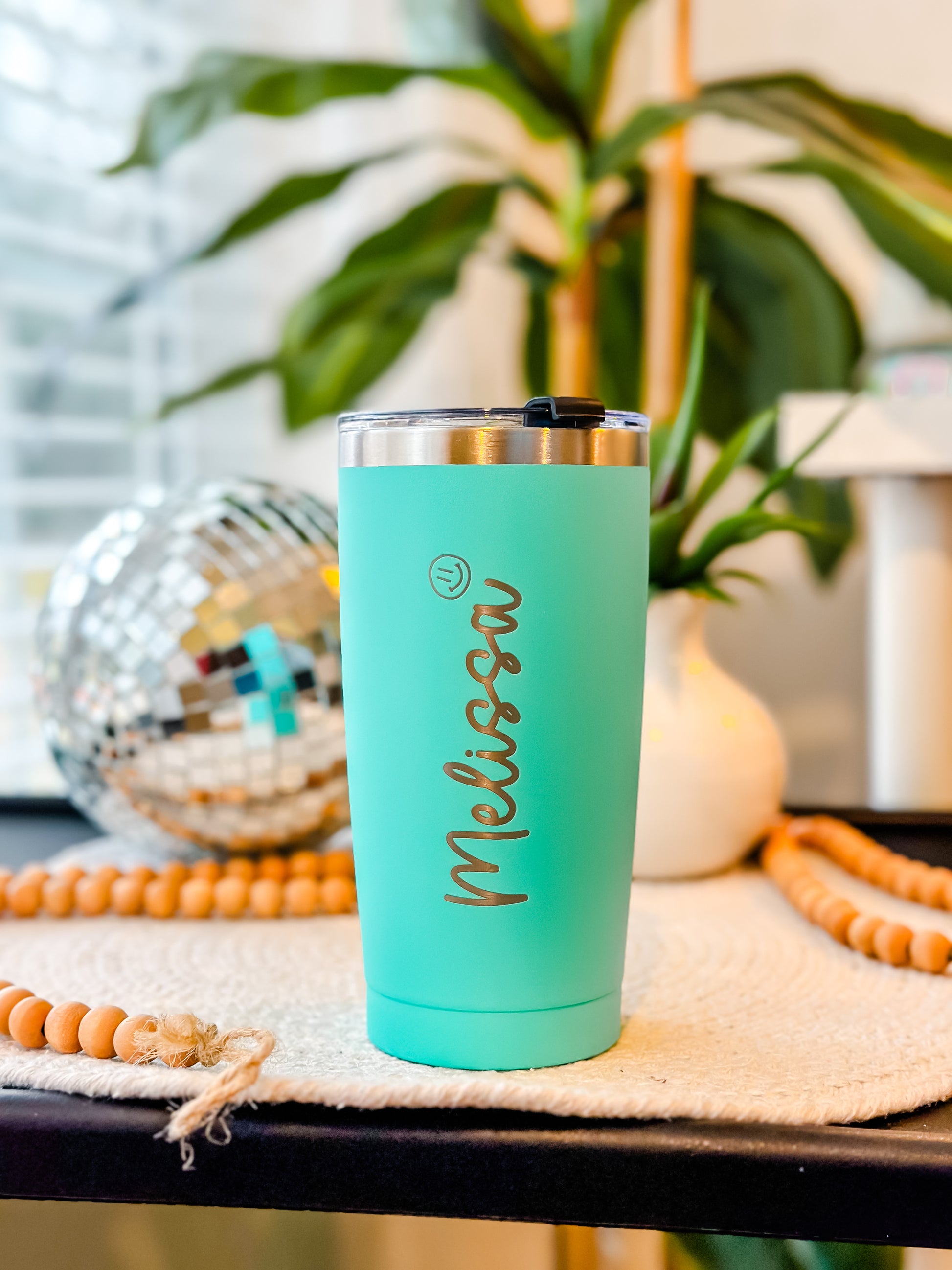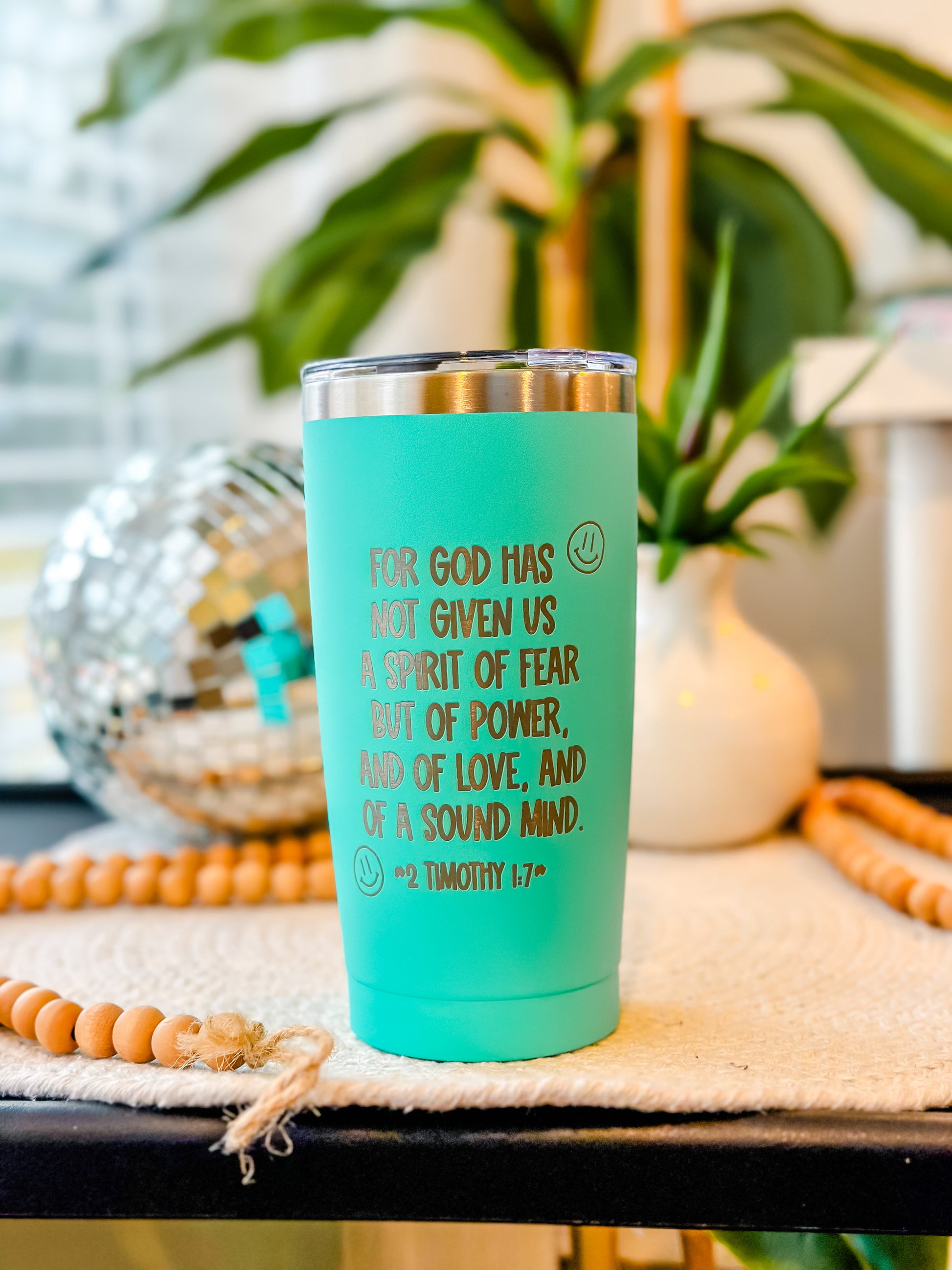 Laser Engraved stainless steel tumbler. Custom cup with name on one side and Bible verse on the other. Currently available in a 20oz tumbler. More cup options to come soon.