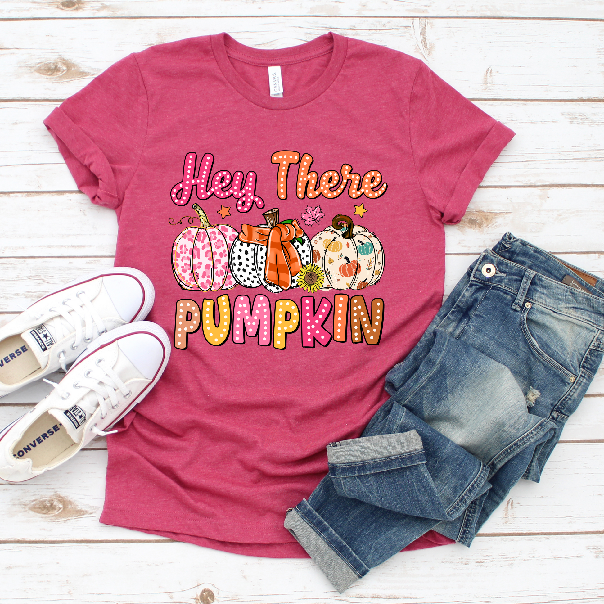 Cute "Hey There Pumpkin" tshirt in bright colorful fonts and pumpkin graphics. Perfect for fall!