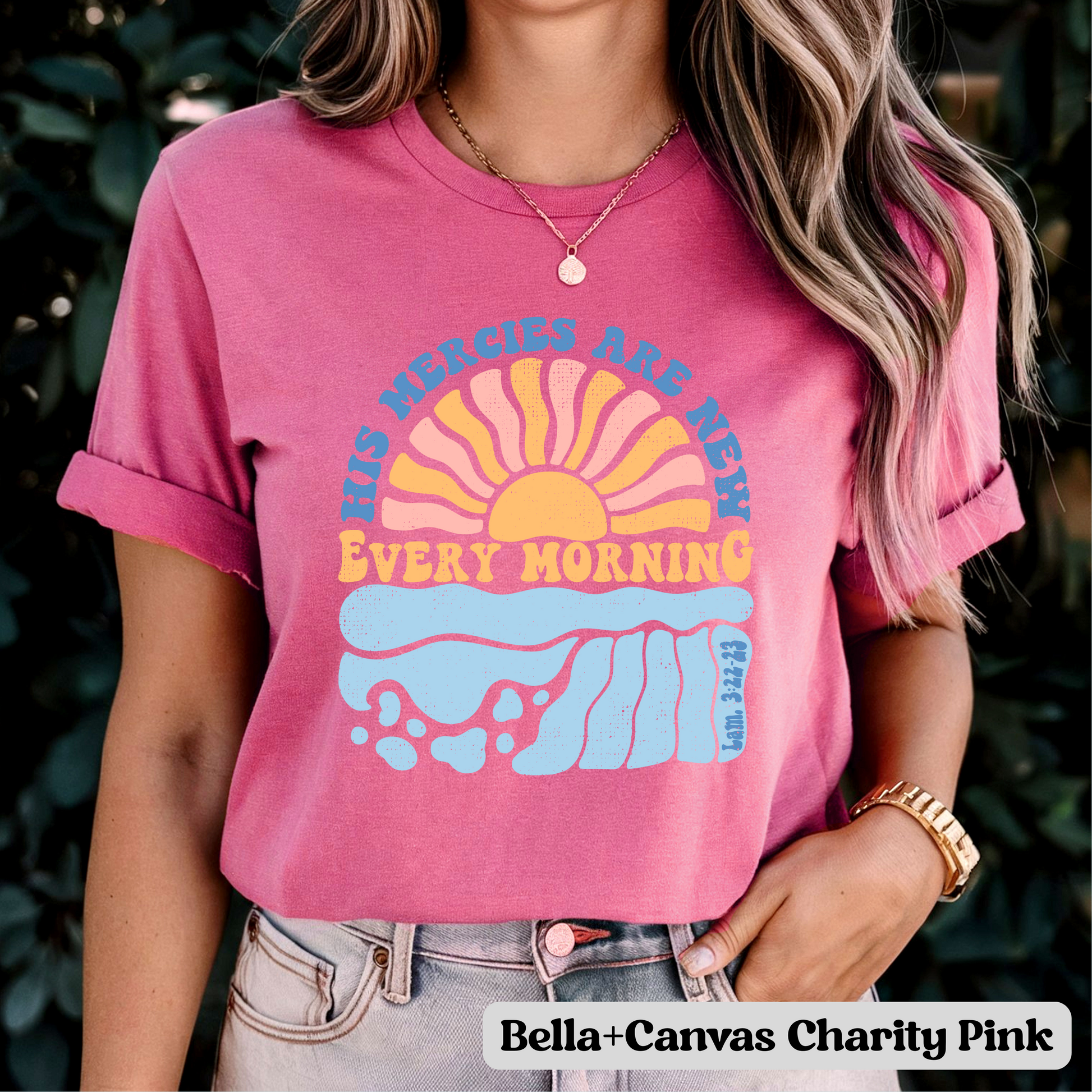 His Mercies are New Every Morning, Lamentations 3:22-23. Cute T-shirt with distressed sunrise and water graphic.