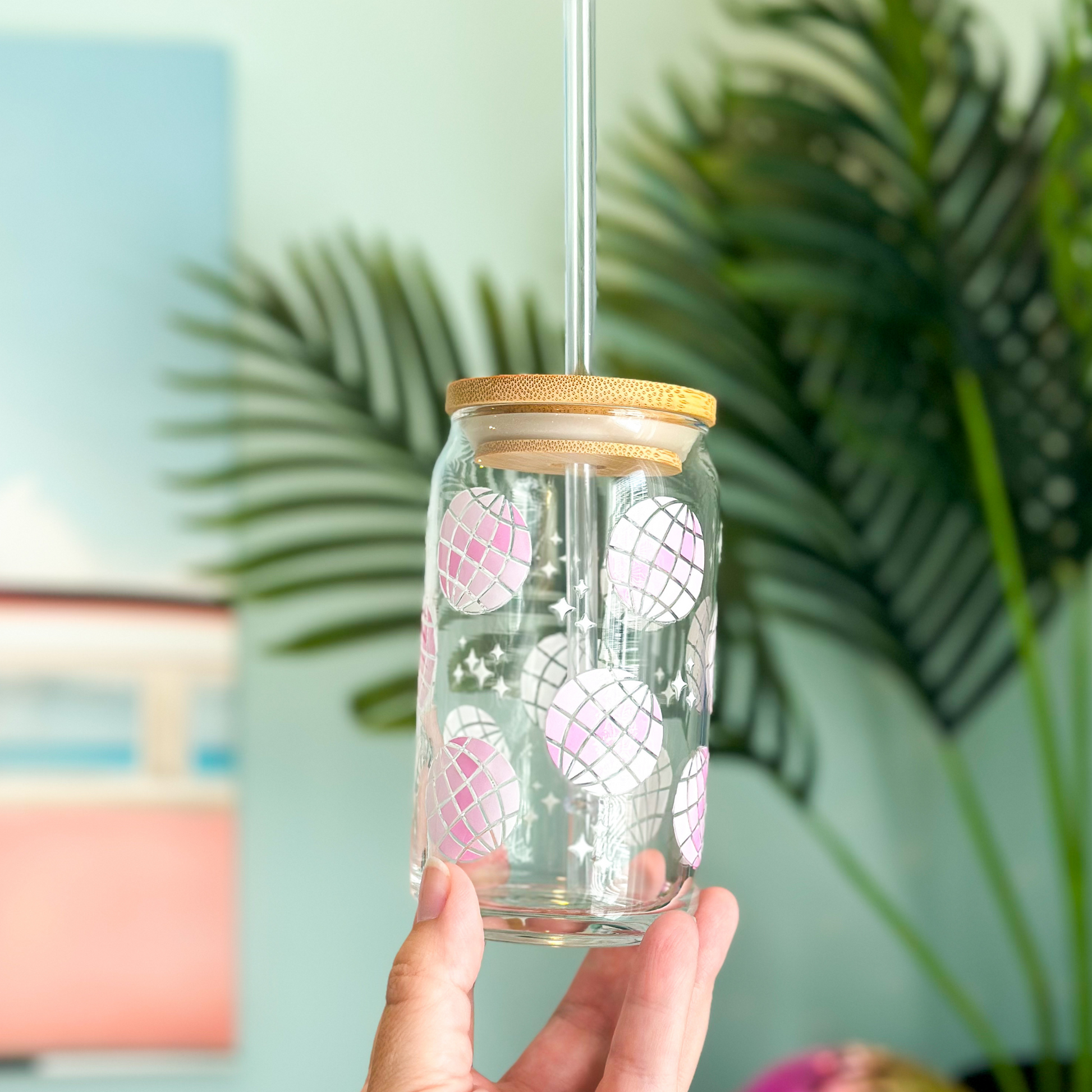 16oz Libbey Glass Cup with UV DTF transfer sticker with light pink disco balls.