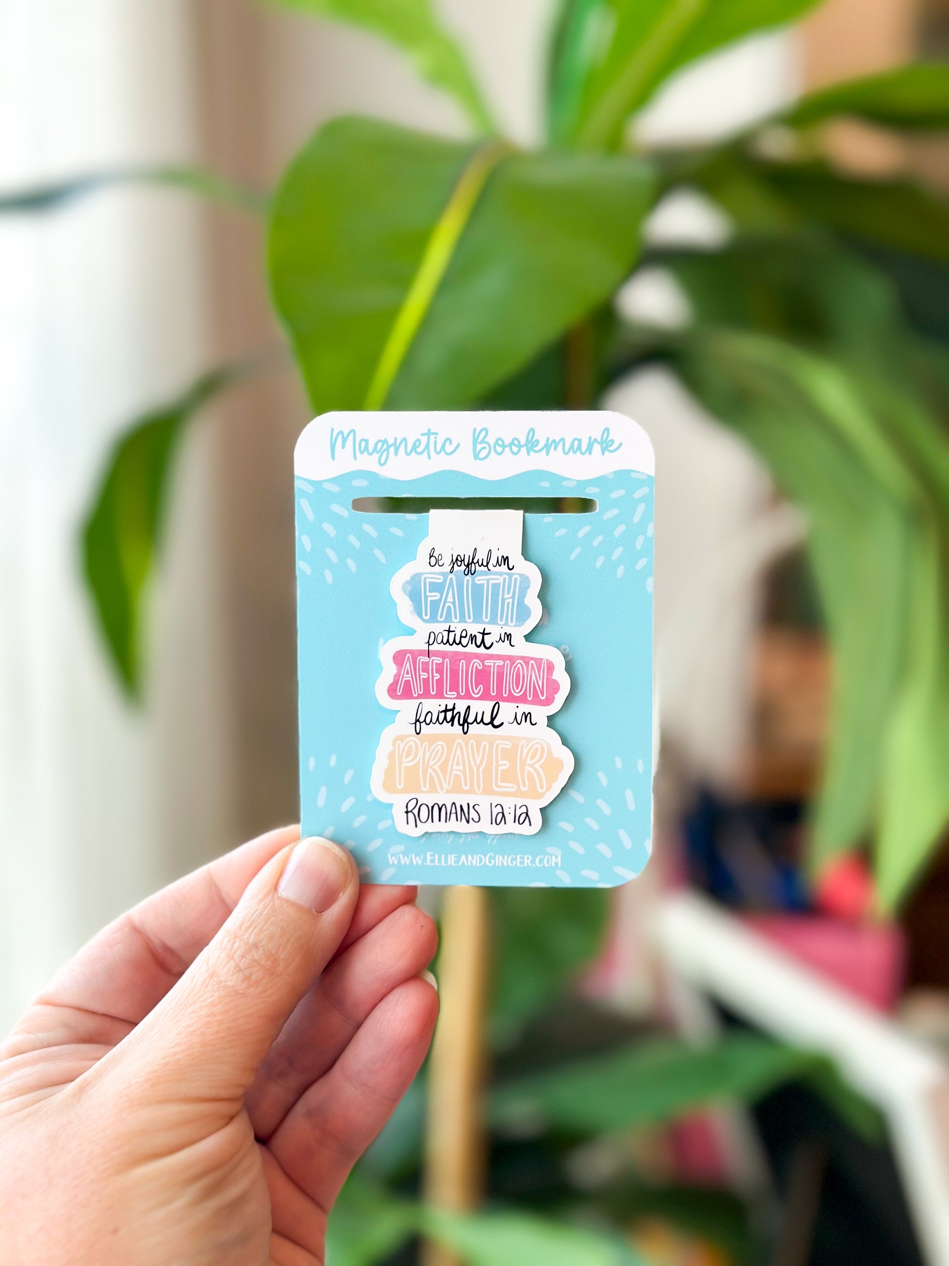 Handwritten bookmark. Romans 12:12 "Be joyful in faith, patient in affliction, faithful in prayer"