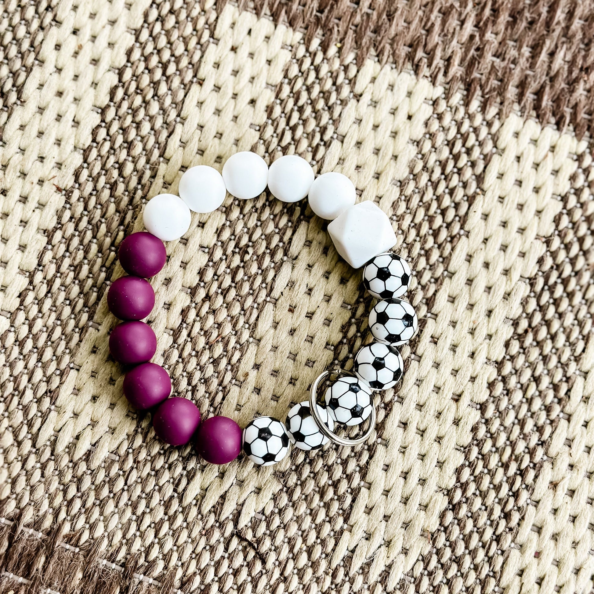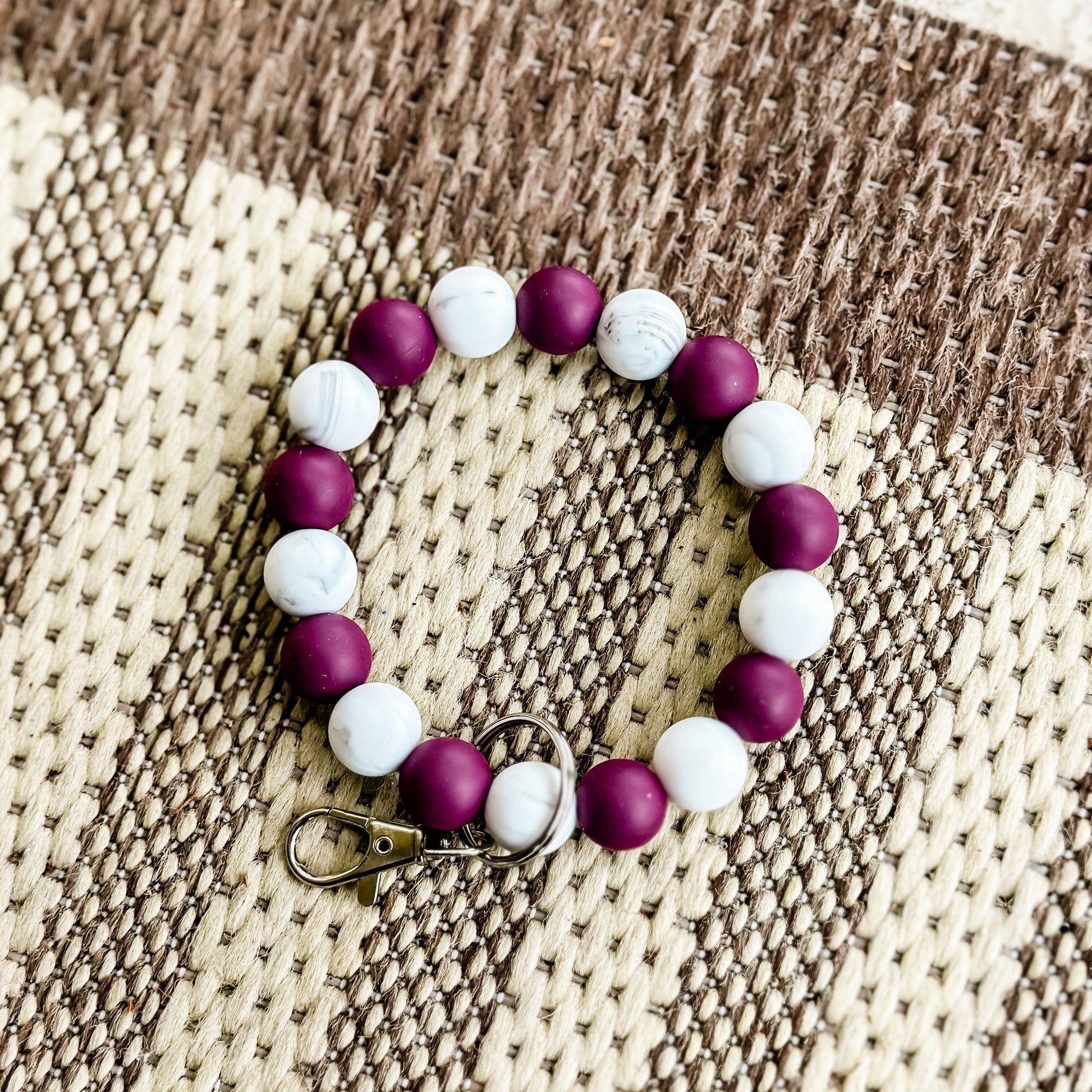 Fun elastic silicone bead wristlet keychain in maroon and marble white/gray beads. Choose between 3 patterns including color block, alternating colors, and color block with sports. Made with a double layer of thick elastic for a durable keychain. One size fits most. Comes with a lobster claw attachment for keys