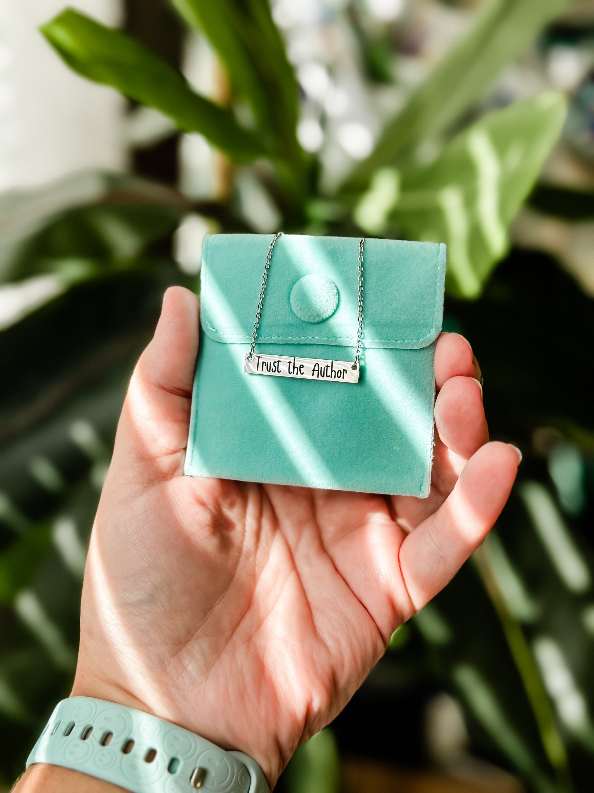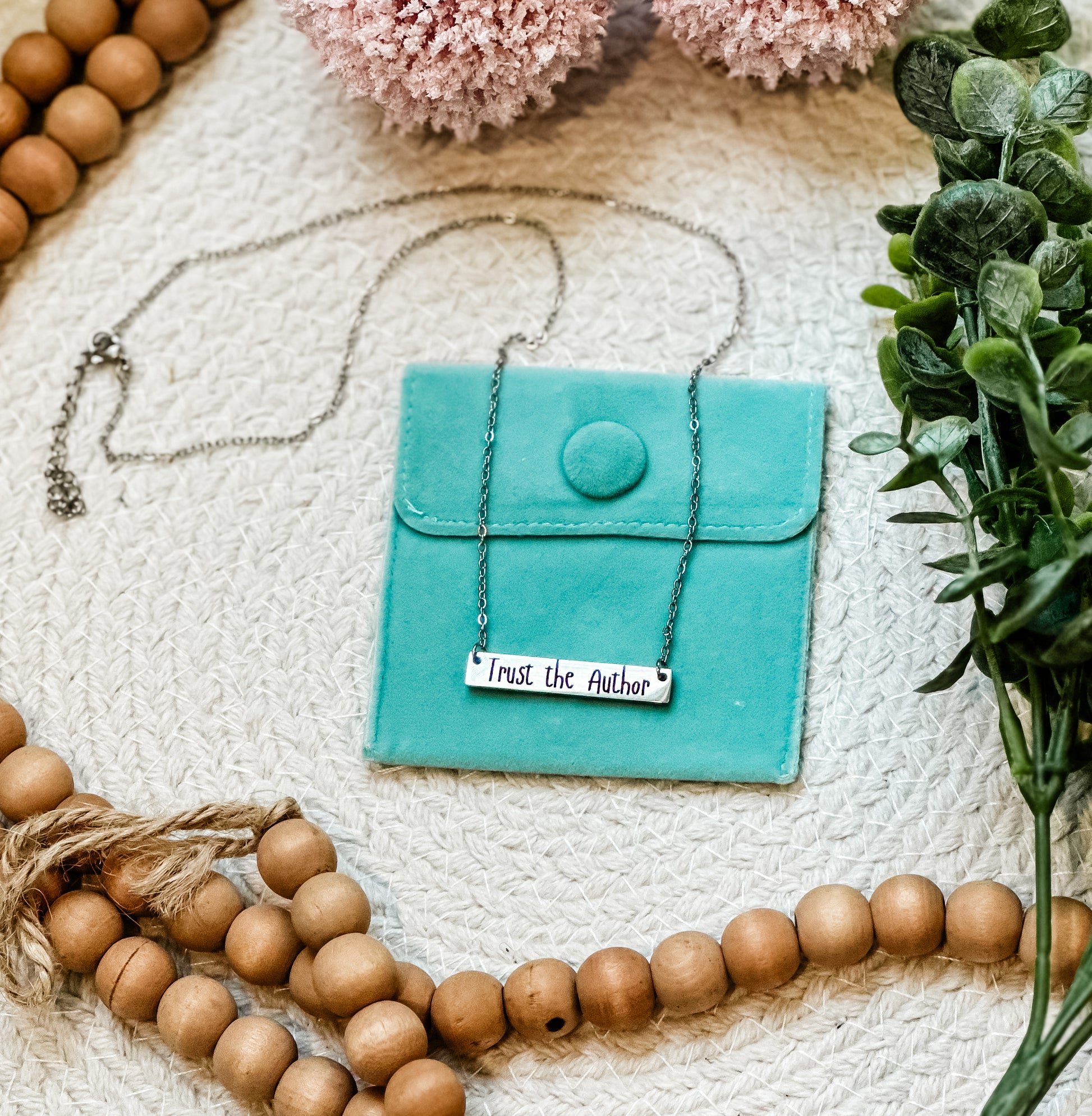 Stainless Steel Bar Necklace and Chain. Bar is 1.3" long. Chain is approximately 18" plus a 2" extender. Comes with a cute aqua velvet jewelry pouch and cleaning cloth.