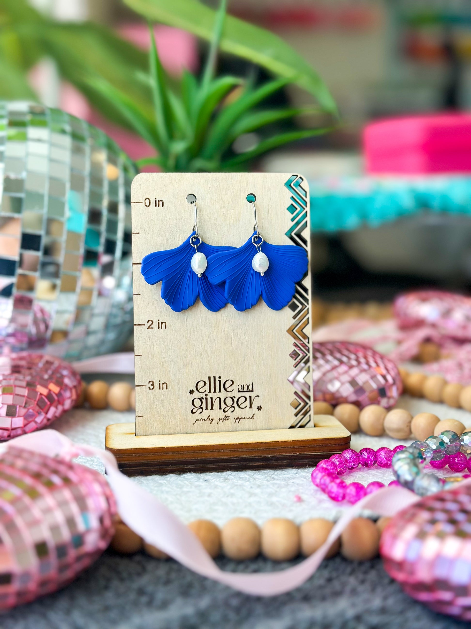 Beautiful Royal Blue Ginkgo leaf dangle earrings with a little pearl embellishment. Made of light weight acrylic with a surgical stainless steel earring wire.