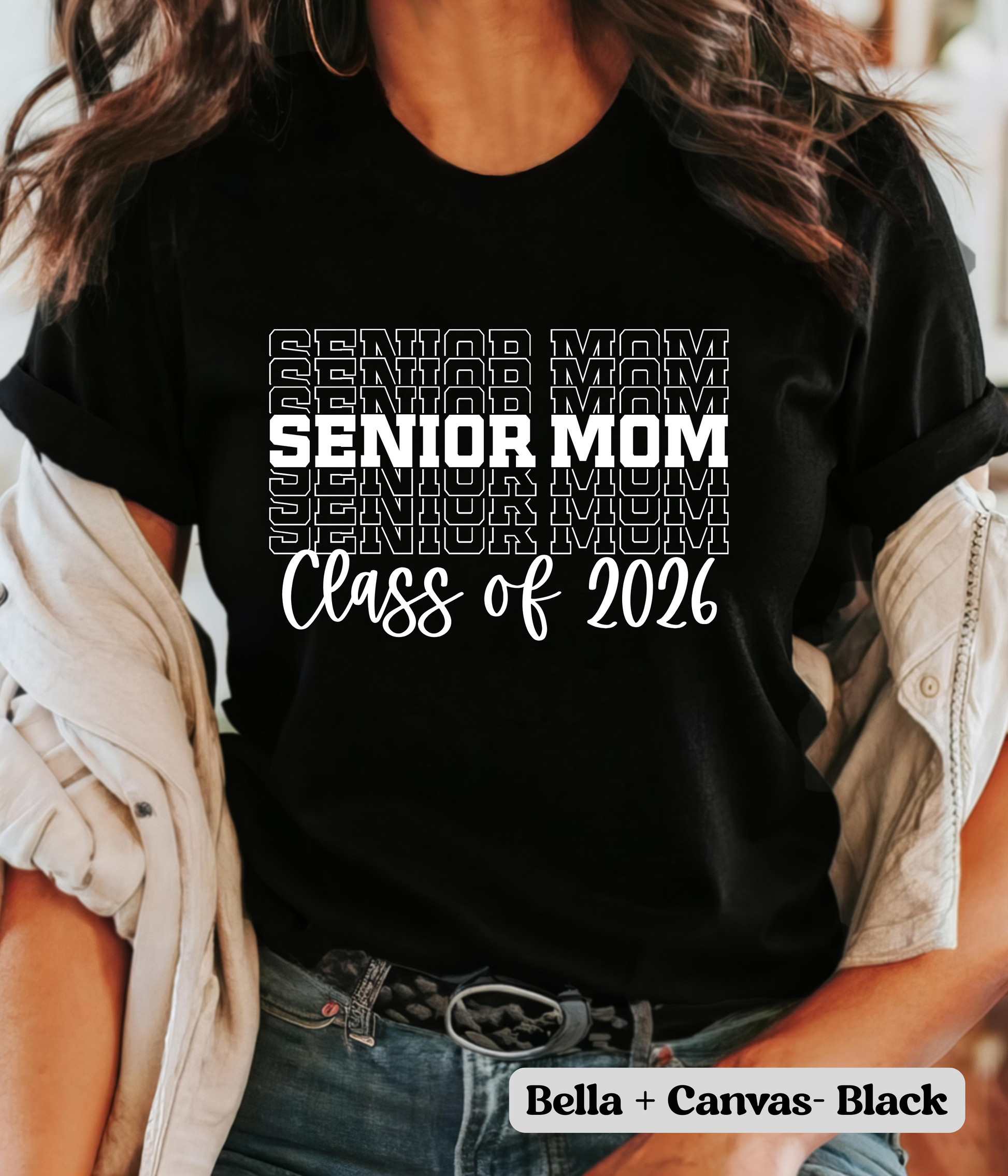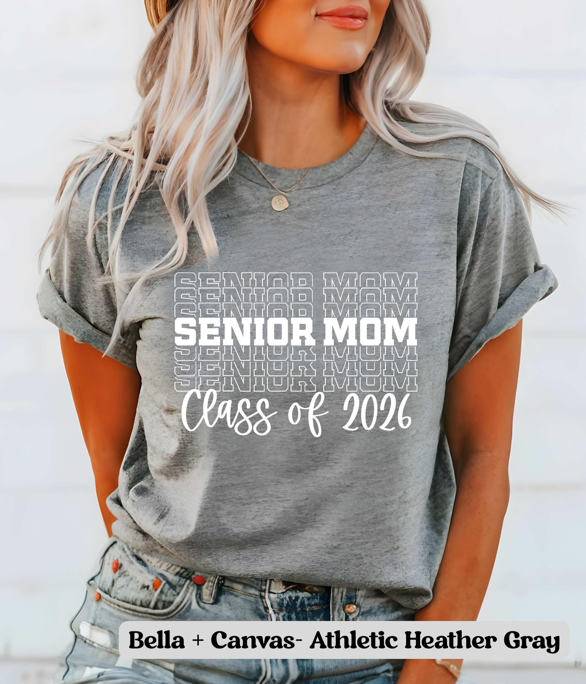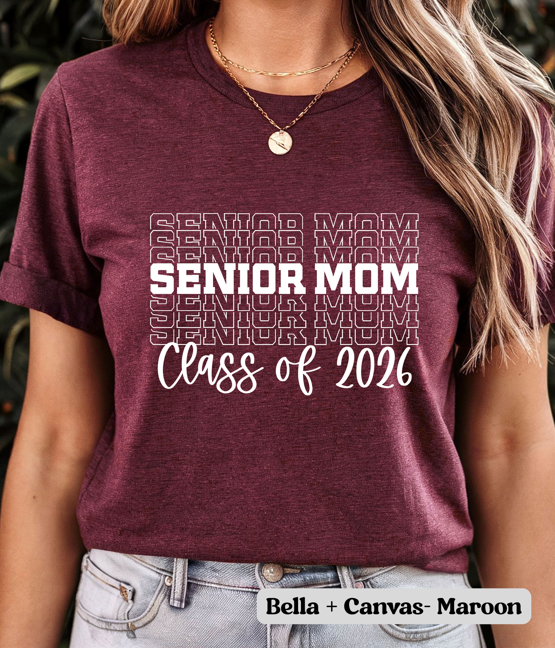 Senior Mom 2026 with stacked words. Choose between Maroon, Heather Maroon, Athletic Gray, and Black. Brand is Bella+Canvas. If you would like a different color or brand of shirt, please feel free to reach out to me via email at ellieandgingerco@gmail.com.