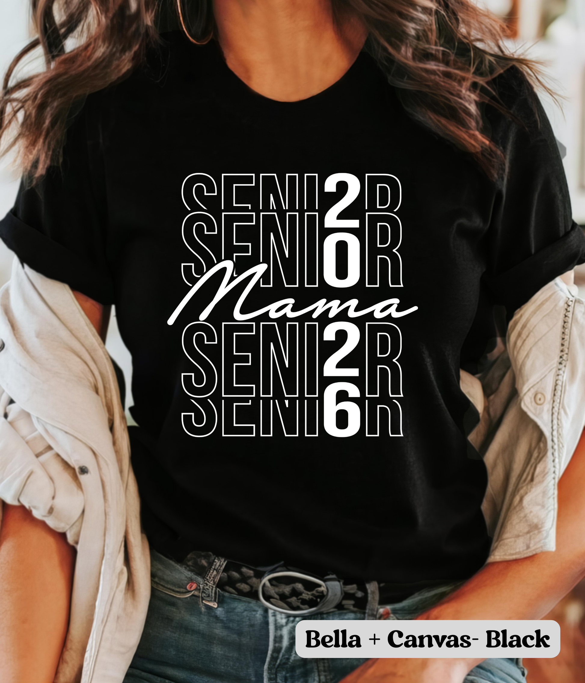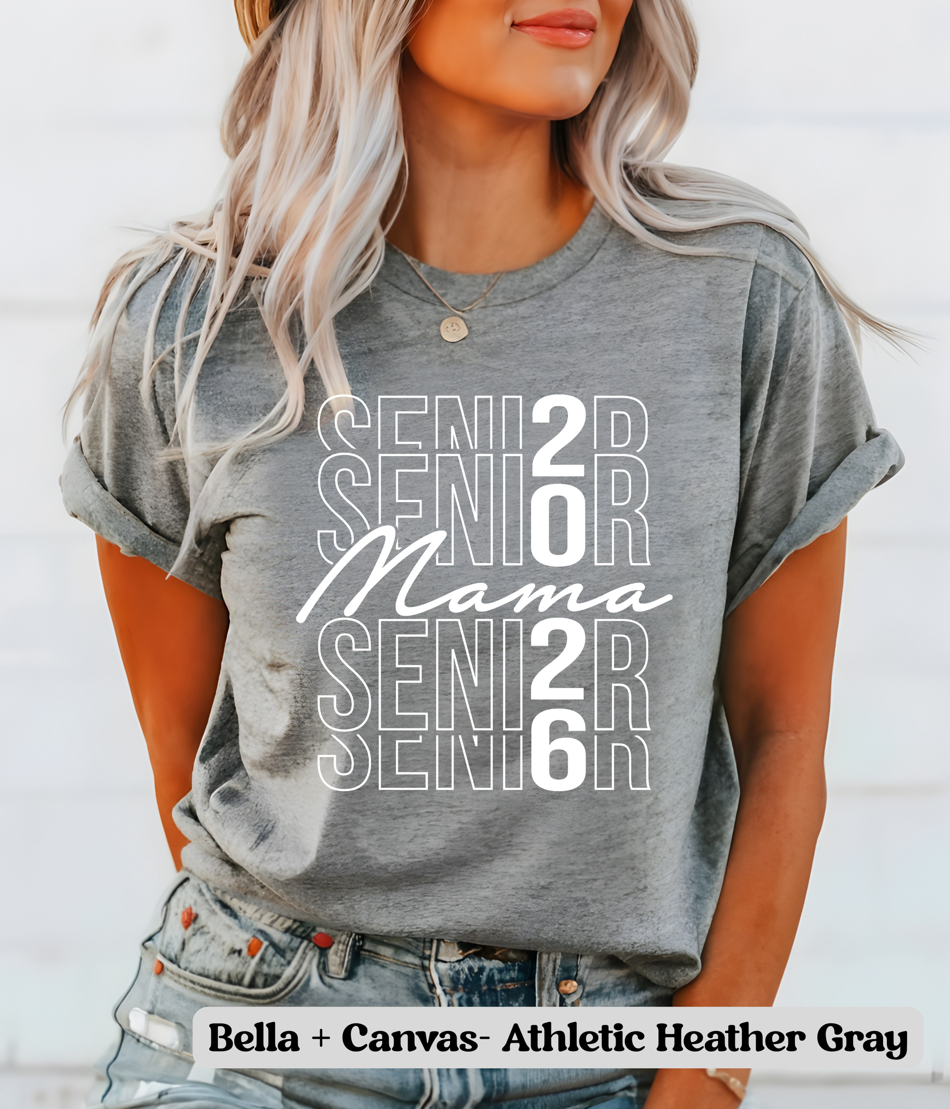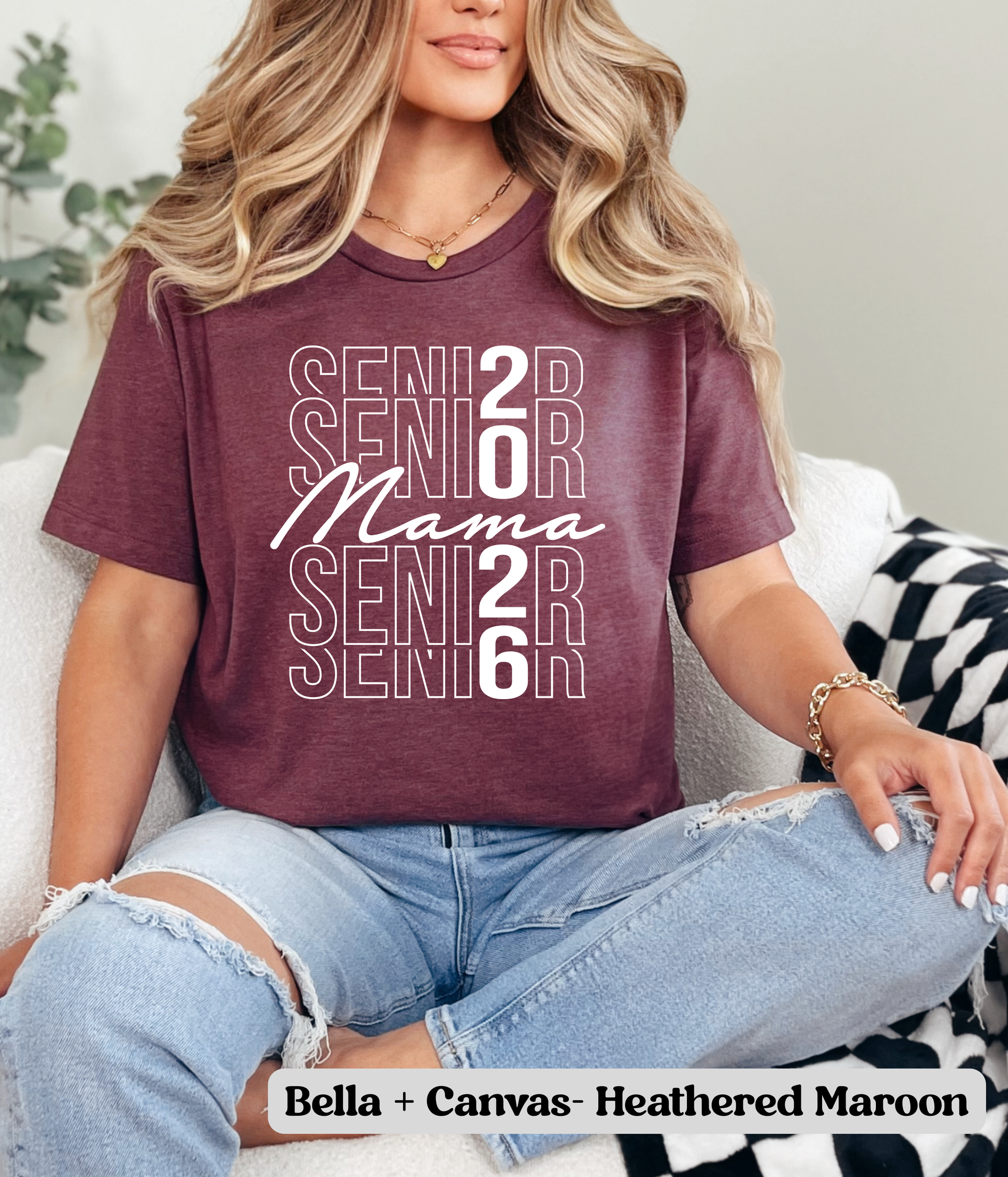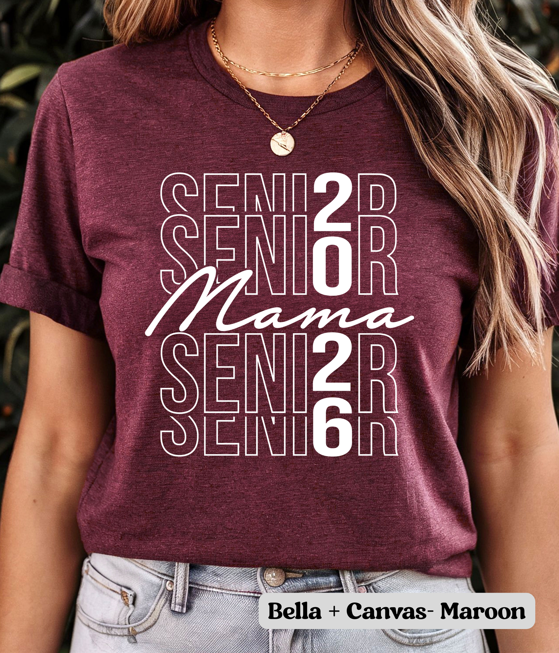 Senior Mom 2026 with stacked words. Choose between Maroon, Heather Maroon, Athletic Gray, and Black. Brand is Bella+Canvas. If you would like a different color or brand of shirt, please feel free to reach out to me via email at ellieandgingerco@gmail.com.