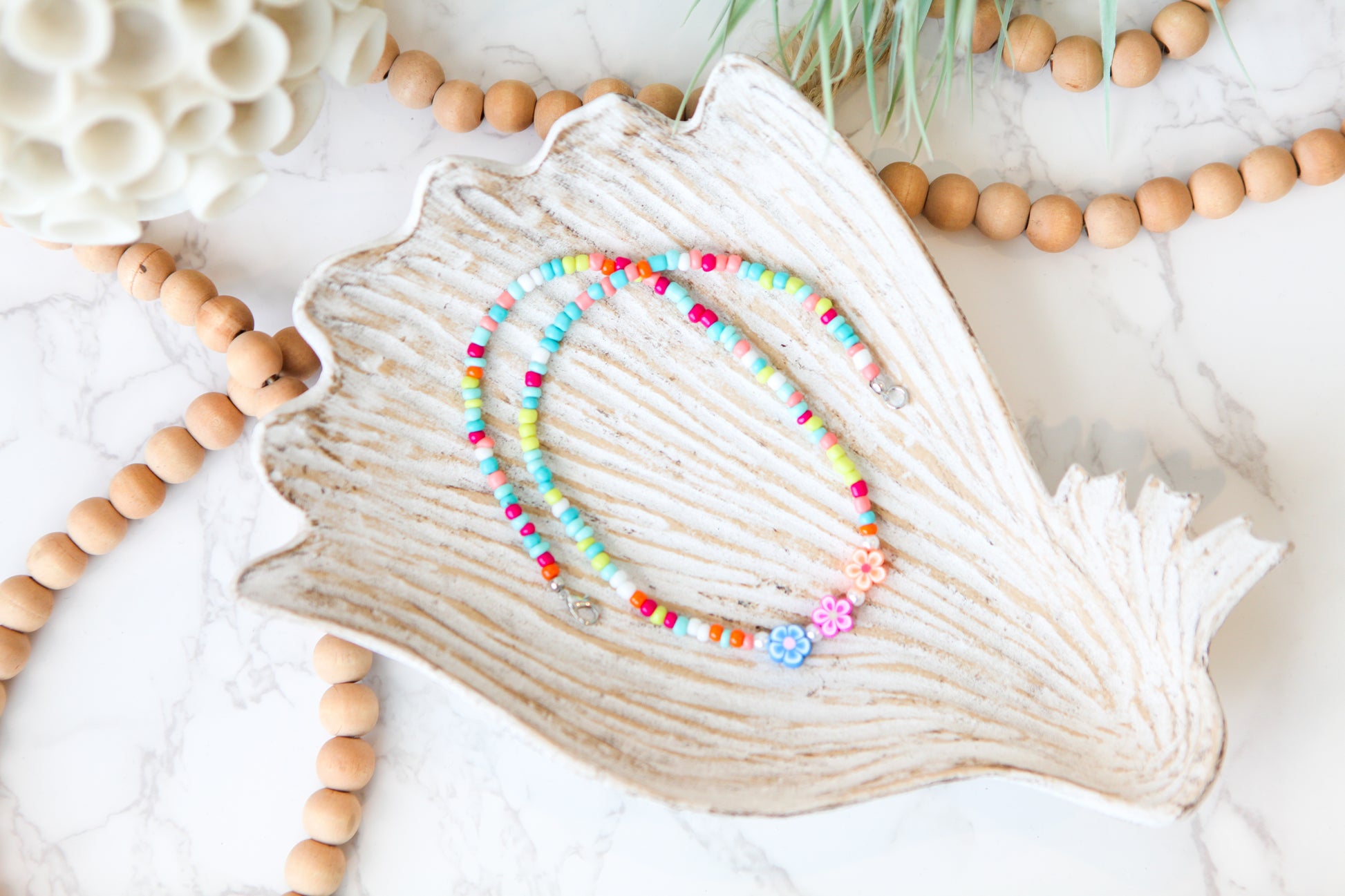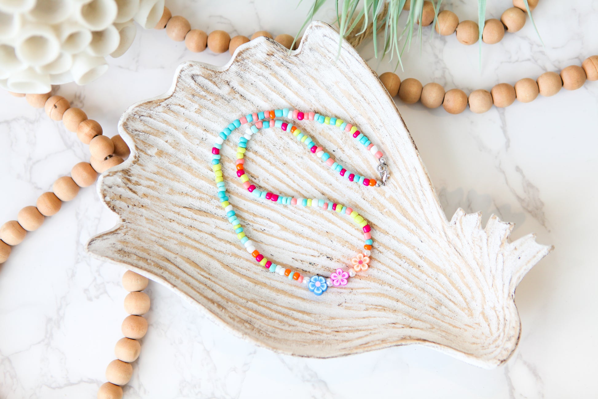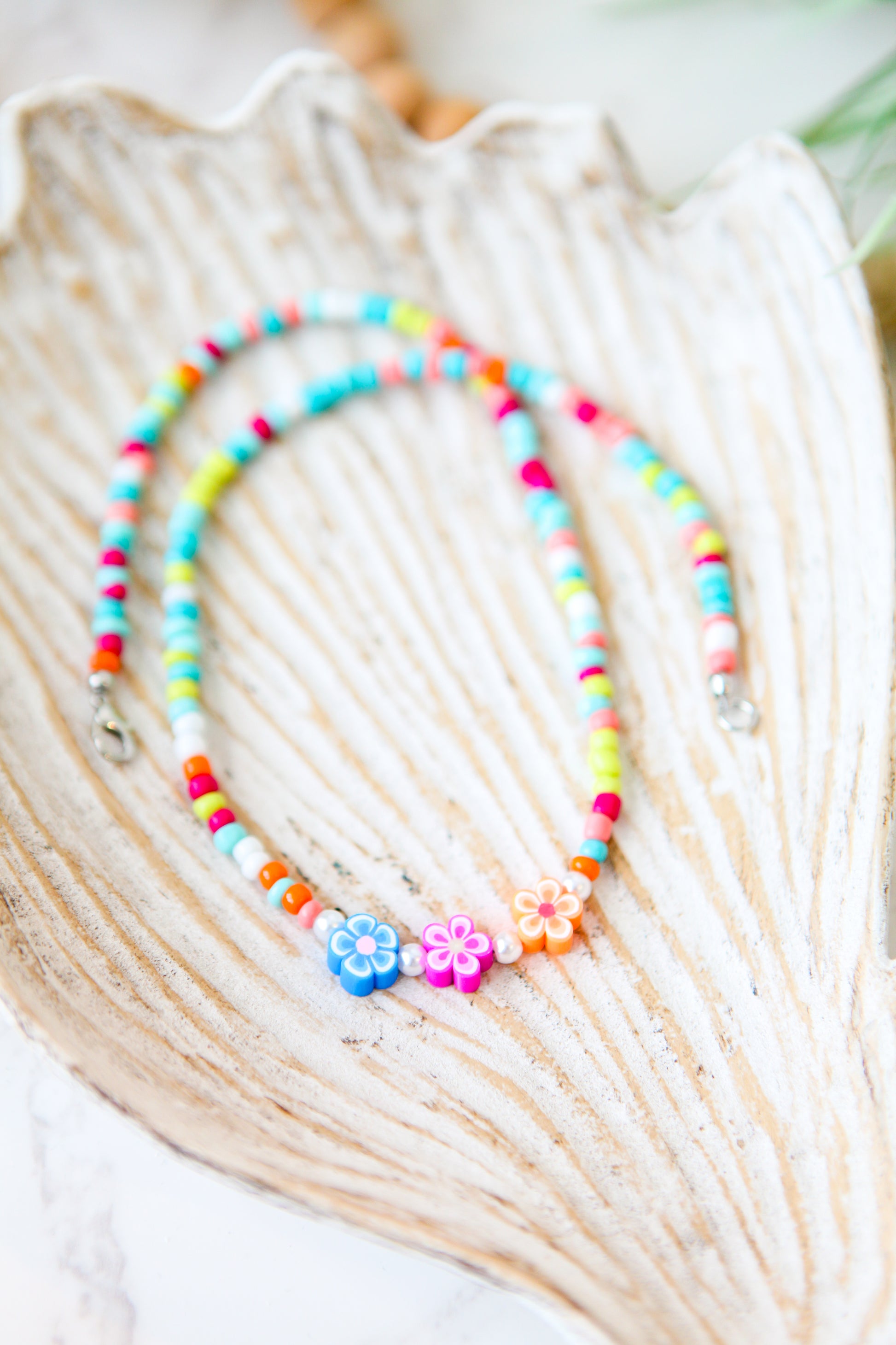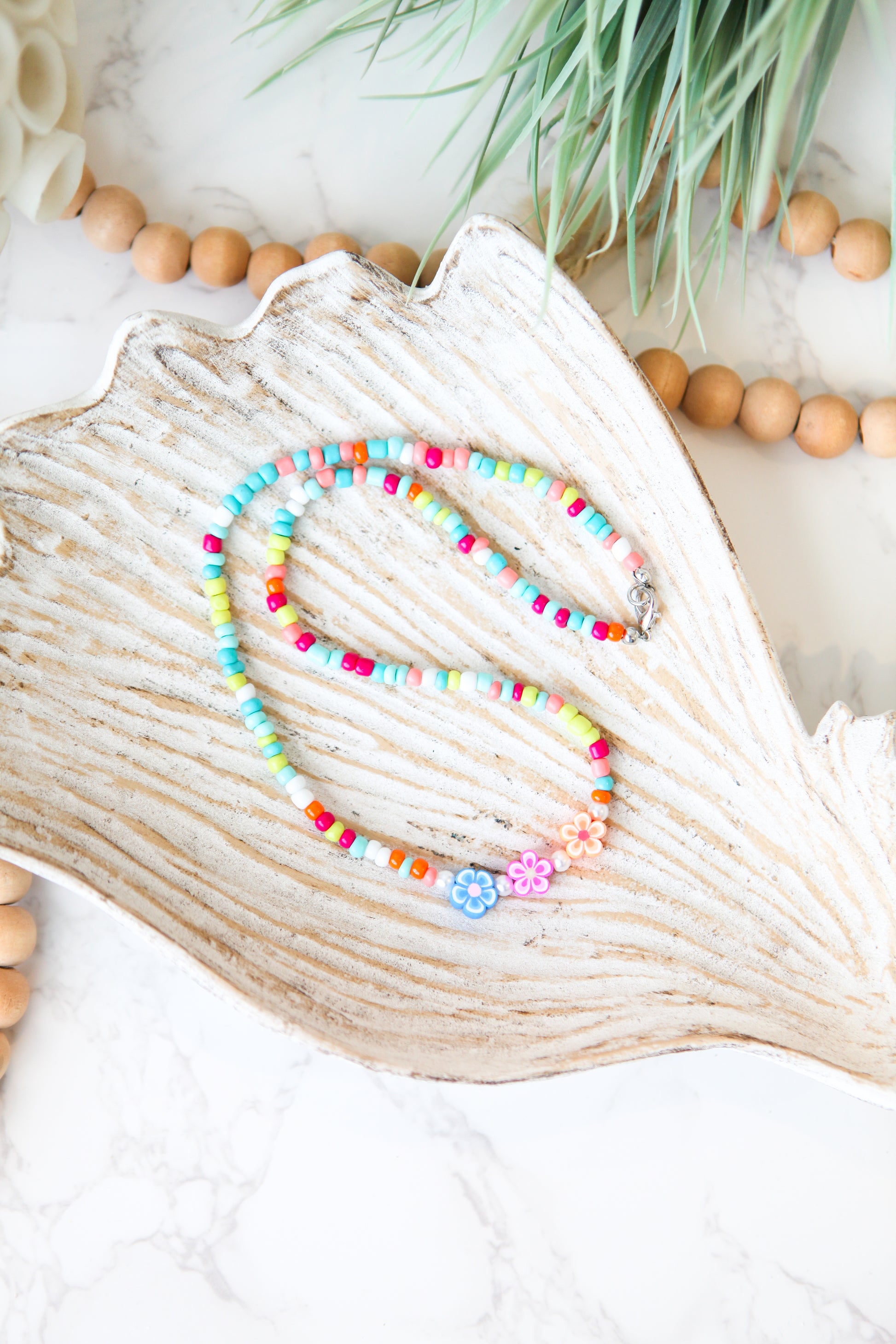These summer colors really can be a staple year round because if I'm being honest, they are my favorite and they bring me joy... so I was thinking surely I wasn't the only one! This necklace has a few cute flowers in the middle to bring all the colors together. Necklace measures approx 18" long.