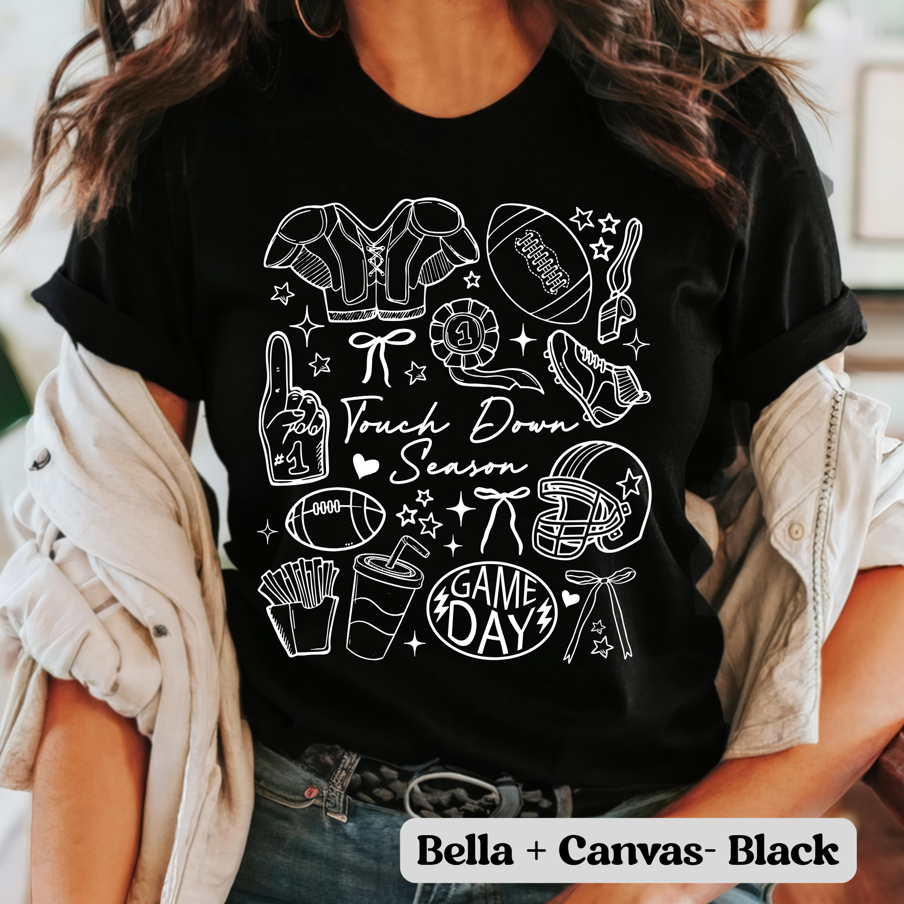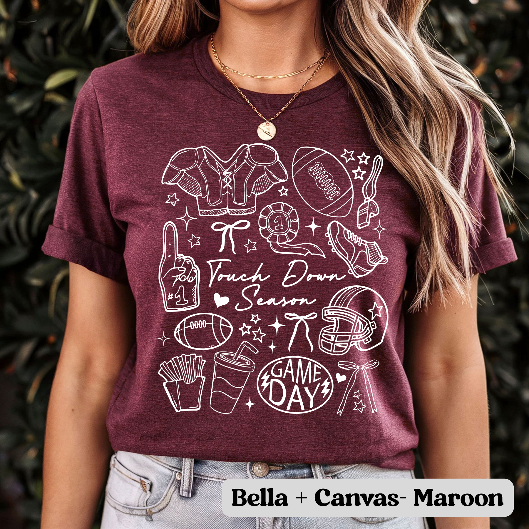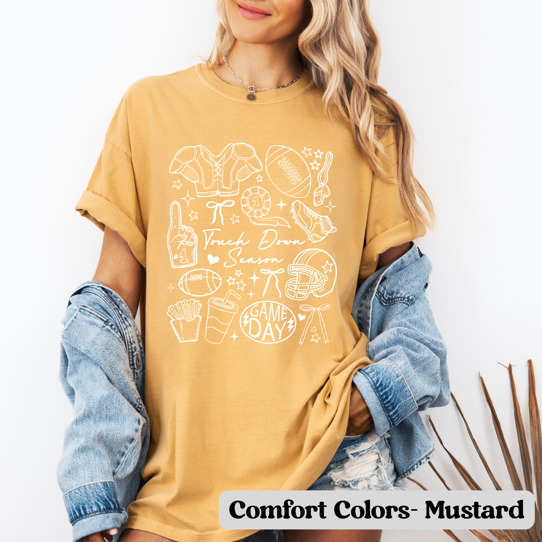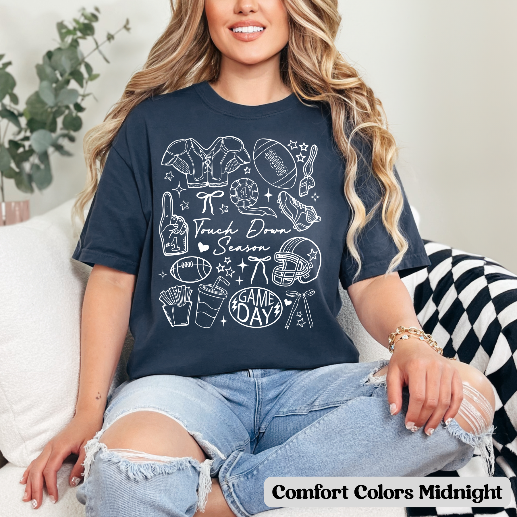 Cute shirt for football season with a collage of assorted football game day graphics. If you are looking for a different color shirt than what I have listed, feel free to send me a message or email me at ellieandgingerco@gmail.com.