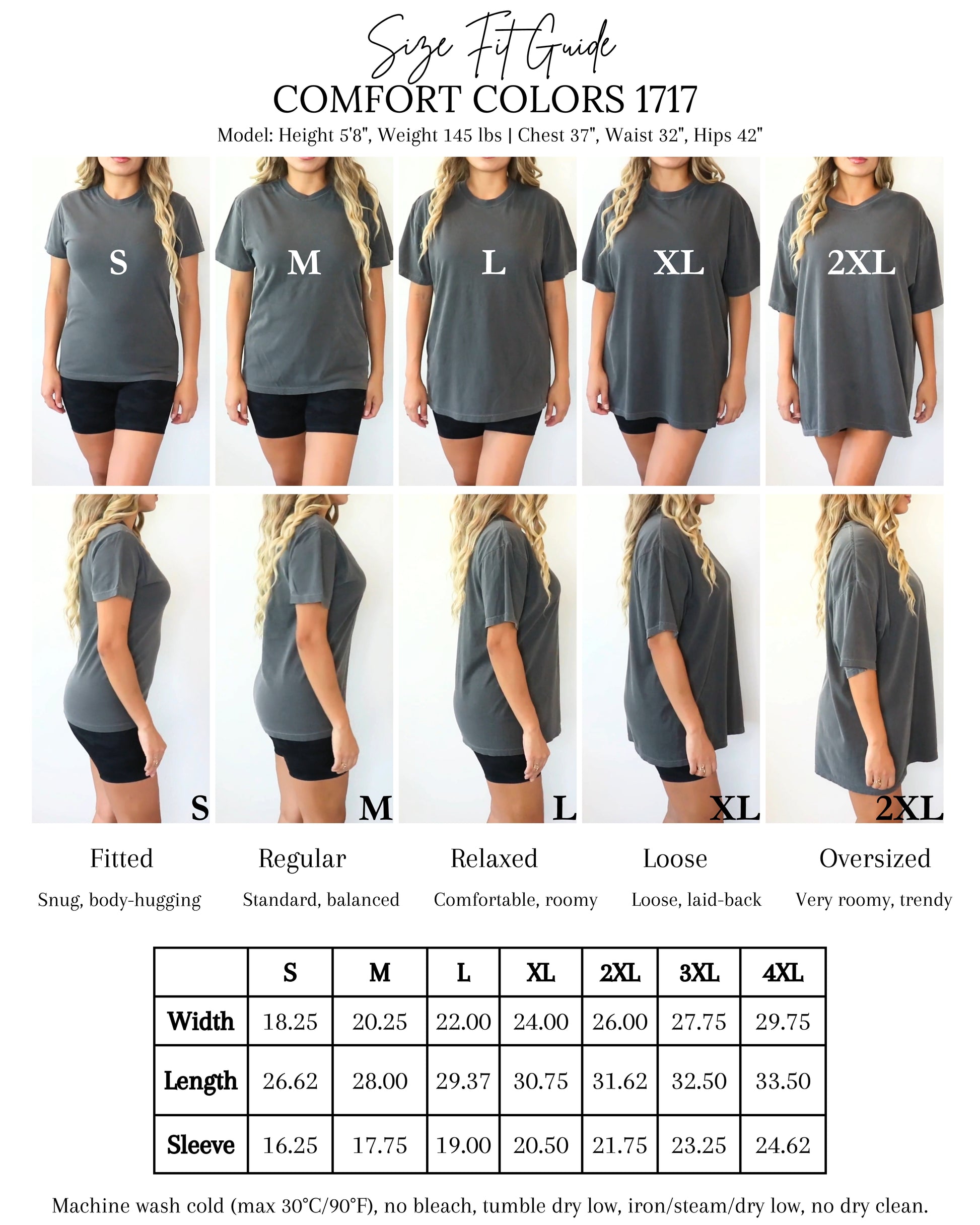 **Please see different size charts to help you choose the best fit for you. The Bella+Canvas tends to be a little more fitted whereas the Comfort Colors is more of a boxy feel and a bit thicker.