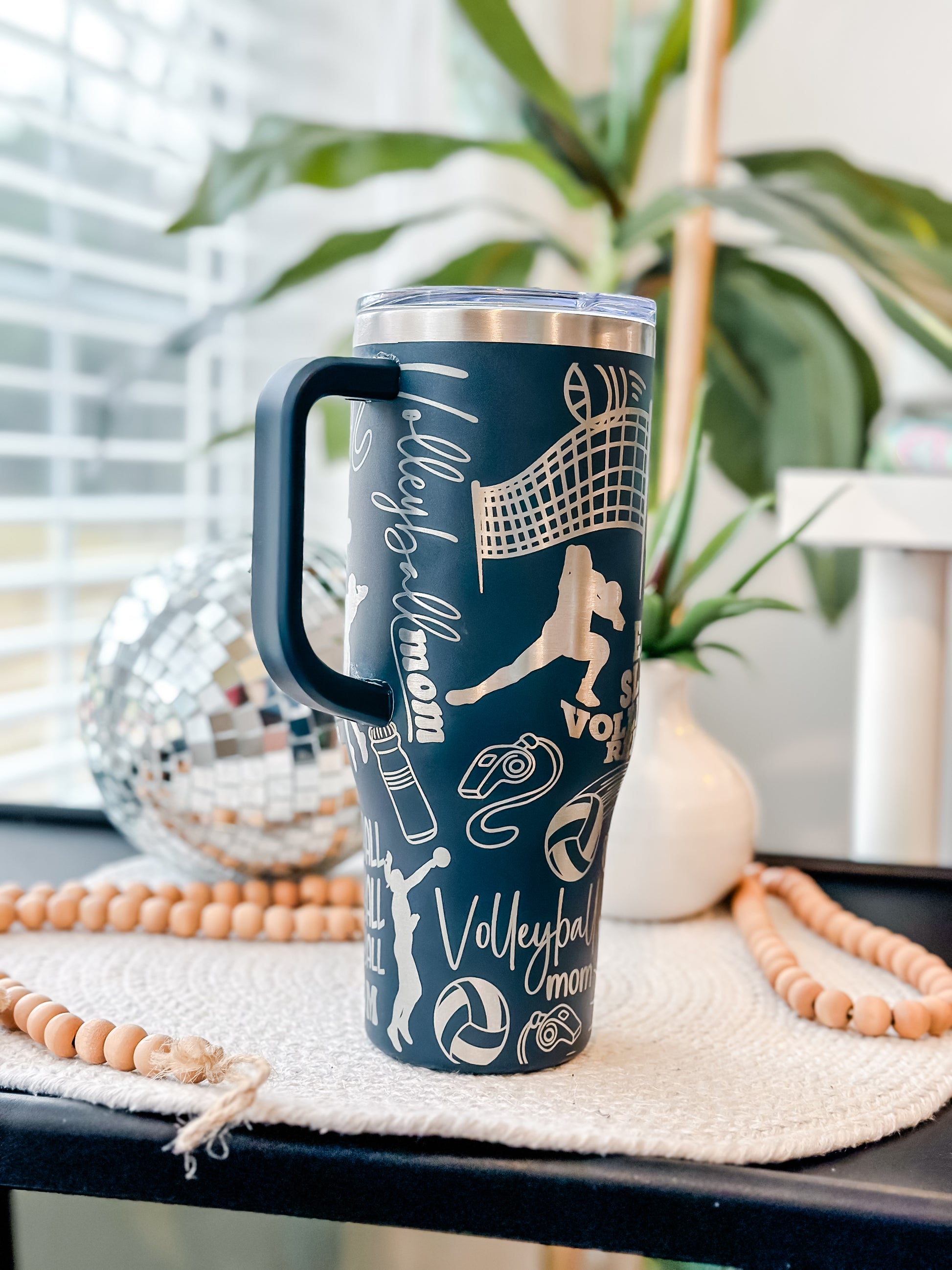 Laser Engraved stainless steel tumbler. Full wrap with baseball mama designs all over (see pictures for full view of all the way around the cup). Currently available in a 40oz tumbler with handle. More cup options to come soon.